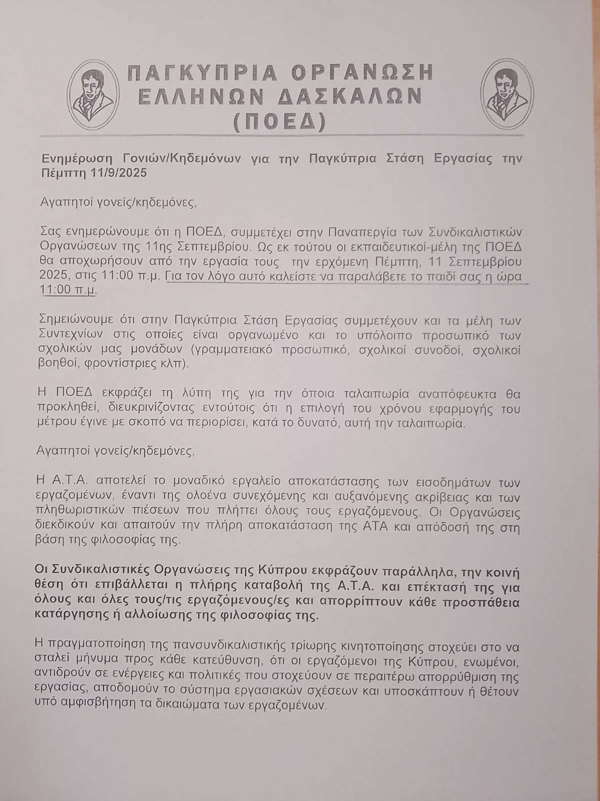Ενημέρωση γονέων/κηδεμόνων για την Παγκύπρια Στάση Εργασίας την Πέμπτη, 11/09/2025