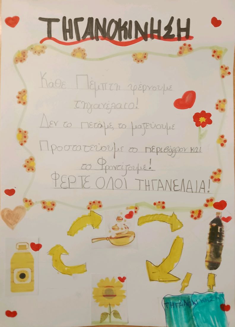 Σας παροτρύνουμε λοιπον, αγαπητά παιδιά και αγαπητοί γονείς, ΝΑ ΦΕΡΝΕΤΕ τα ΤΗΓΑΝΕΛΑΙΑ σας στο σχολείο ΚΑΘΕ ΠΕΜΠΤΗ, ώστε να στηρίξετε την προσπάθεια του σχολείου μας. Με αυτό τον τρόπο βοηθάμε το περιβάλλον αλλά στηρίζουμε και το σχολείο οικονομικά, αφού ανάλογα με την ποσότητα των τηγανέλαιων που θα συλλέξουμε θα εισπράξουμε και τα ανάλογα χρήματα.